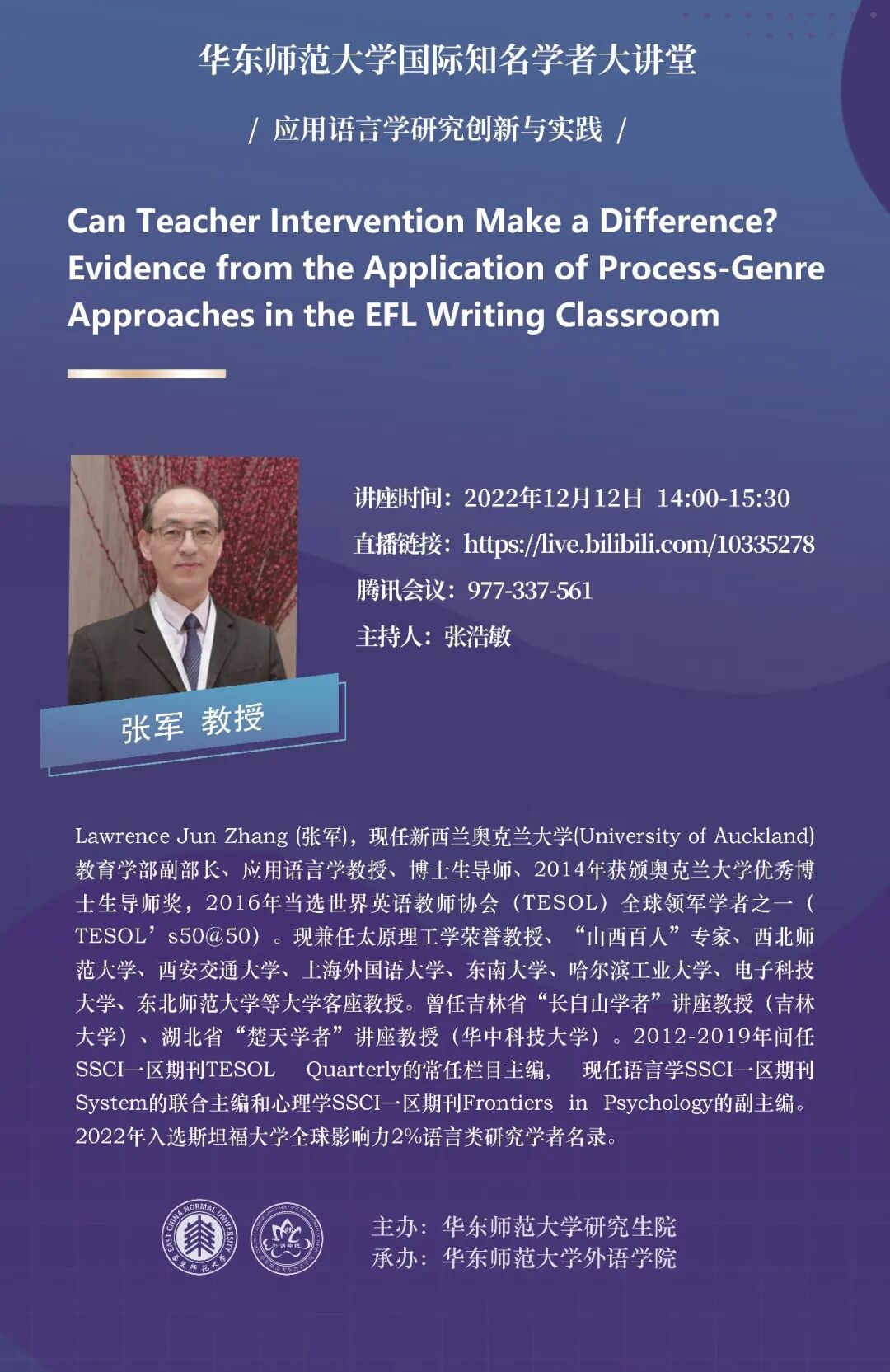 在本次报告中,张军教授将探讨近年来越来越受欢迎的写作教学的过程体裁方法,阐述什么是过程体裁方法?教师如何实施它们?他们对中国英语学习者有用吗?并通过报告在中国大学进行的课堂干预来进行实证总结。