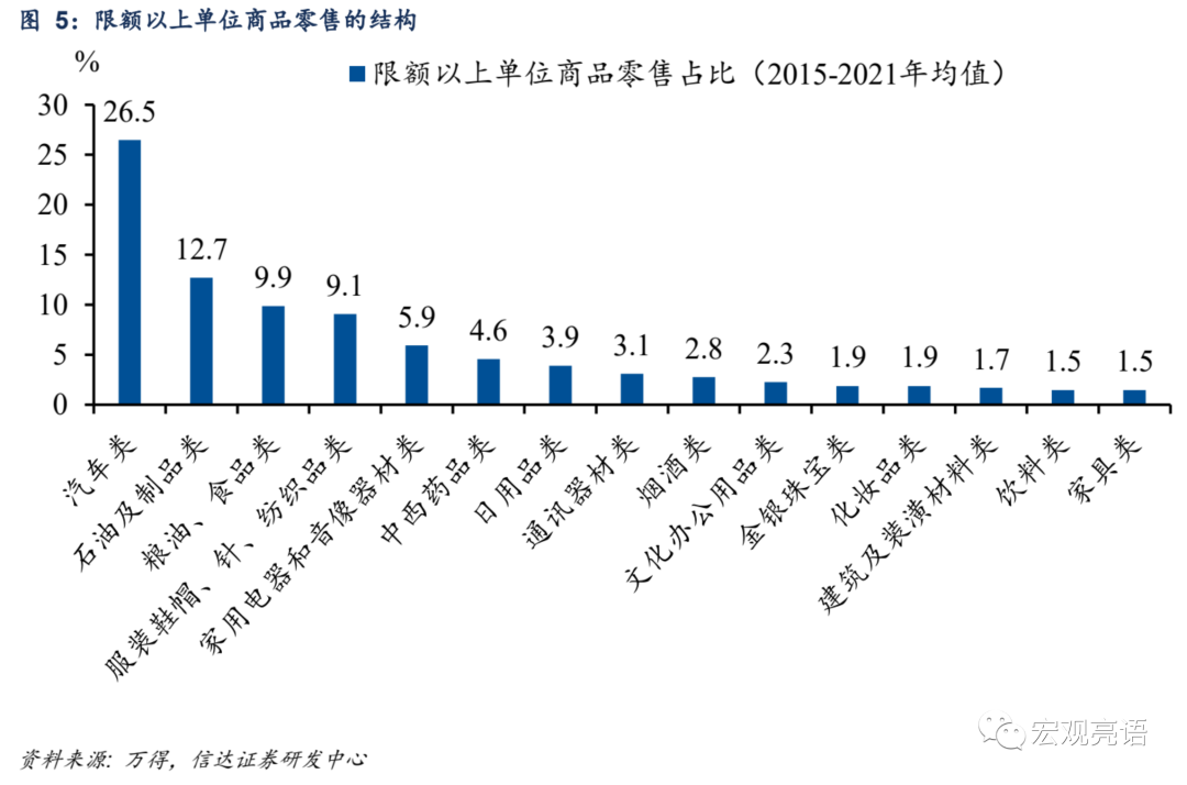按照消费类型,可以将社零分为商品零售和餐饮收入。两者在社零中的占比较为稳定,商品收入占9成,餐饮收入占1成。2010年以来,餐饮收入和商品零售同比增速的走势一致性较强,但曾出现两次明显的背离,一次是2012-2013年,一次发生在2020年。2012-2013年的背离源于2012年底中央“八项规定”的出台,严禁用公款大吃大喝或安排与公务无关的宴请,致使餐饮消费增速下滑。2020年则是由于我国采取严格的防疫措施,居民接触性、聚集性消费受到阻碍,2020年上半年、以及2022年二季度,餐饮收入被砸出深坑。除了消费大类,统计局每期还会公布限额以上商品零售额的详细数据。具体而言,对于限额以上商品零售,国家统计局根据商品的主要用途和性质对其进行分类并公布15个细分项目。依据2015年-2021年各分项的平均比重排序,汽车类和石油及制品类名列前茅,分别占限额以上商品零售额的26.5%、12.7%。其次是粮油食品(9.9%)、服装鞋帽(9.1%),家用电器和音像器材(5.9%)。这15项绝对值加总小于限额以上商品零售额,统计局并未明确解释其余部分的构成。需要补充的是,限额以上企业零售额占比不到40%,其代表性有限,再加上限额以上的定义决定了不同行业零售额被划入限额以上的比例存在差异,比如汽车行业中大企业居多,汽车的销量更多地被纳入限额以上,而文化办公类、家具类企业中可能小企业更多,属于限额以下的部分较大。因此不能将限额以上商品零售结构与居民真实消费结构简单地划上等号。还有一种常用的分类方式,将消费分为必选消费和可选消费。必选消费指日常生活所必须的消费品,而可选消费是日常生活中非必需的、可选择性的消费。从经济学角度,必选消费的收入弹性系数低,可选消费的系数高。我们将粮油食品类、饮料类、日用品类、中西药品类等五项划分为必选消费;金银珠宝类、通讯器材类、石油及制品类、汽车类等十项划分为可选消费。必选消费与可选消费的零售额比率在3:7左右。其中,可选消费中还能进一步挑选出地产后周期消费,包含建筑及装潢材料、家具类、家用电器和音像器材类,这三项与房地产周期有较强的联系。必选消费的特点主要有以下两个:一是消费频率高,需求的变动较小,因此周期性较弱。二是必选消费表现受 CPI 上行影响较大。CPI上行将带来必选消费品价格方面的增长,助推必选消费表现出增长趋势,但同时也需要关注对量的边际影响。再看可选消费:一是具备较强的周期性,可选消费的需求不像必选消费那样稳定。若经济形势不好,消费者会倾向于将可选消费推迟;而必选消费推迟或削减的空间较小,整体上对经济周期的敏感度较低。二是可选消费具有更新换代的特性。食品、日用品等必选消费几乎没有更新换代的需求,而家电、家具类等可选消费类会受到电商促销活动(如:双十一、618)、产品迭代周期的影响。三、影响居民消费的三大因素:就业、收入和消费倾向