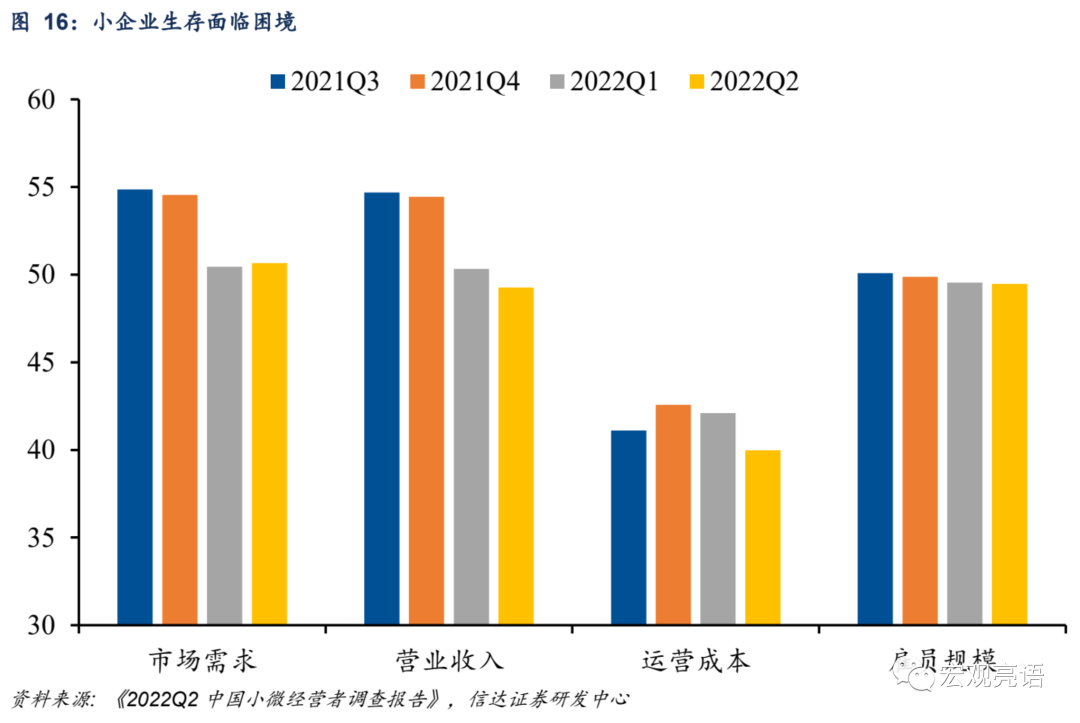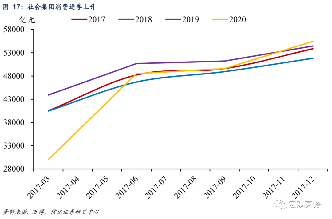 社会集团商品零售主要是对公活动、商务活动等所需实物商品的购买,这些消费容易受商业周期的影响。根据我们拆分的数据结果,可以发现社会集团消费在年内呈现上升趋势,并于四季度达到高点。我们推测这一特征背后的原因主要是:1)企事业单位的生产经营活跃度在一季度相对较低。企事业单位的商务活动和公关活动开展,与其生产经营活动是密不可分的,而企事业等各单位在年初,特别是春节期间的生产、经营活动一般较少,因此社会集团的消费也会随着年初生产活动的减少而有所回落。2)大多数企业常于年底为职工发放实物性奖励和年底福利。年底实物奖励和福利发放的需求,增加了单位的消费支出。疫情反复冲击下,社会集团消费的增速下滑较多,占比也远不及疫情前。2020年社会集团消费同比下降8.3%。2021年呈现修复态势,两年平均增速为0.55%,但与疫情前的增速水平6.6%相比,尚有很大差距。2022年上半年疫情再次发酵,社会集团消费同比再次转负,下降3.4%。与之相比,2021年,2022年上半年,居民消费的同比增速分别为6.2%、1.7%,要明显高于社会集团消费,这说明社会集团消费下滑是社零的最大拖累。一个是因为政府要过紧日子的导向。2021年3月5日,李克强总理在《政府工作报告》中提及“各级政府都要节用为民、坚持过紧日子,确保基本民生支出只增不减”。政府部门包含在社会集团范畴内,紧日子导向下政府消费的增长动力不足、增长空间有限。二个是疫情管控下各种单位对于公务接待、大型活动和会议等更为谨慎。在未来,除非疫情完全消除,或是国家改变疫情防控策略,包括政府和企事业单位等在内的所有社会集团消费大概率仍将受限。三是小微企业经营面临困境。北京大学、中国社会科学调查中心和蚂蚁集团发布的《中国小微经营者调查 》显示,小微企业经营状况在2021Q4至2022年Q2期间连续两个季度下滑,以市场需求、营业收入、运营成本、雇员规模四个指标衡量的小微企业信心指数从 2021 年四季度的50.4下降至今年二季度的 47.3,深陷于荣枯线之下。小微企业的数量占比较高,是消费的一大主力,在经历了两年有余的疫情持续扰动后,利润走低和现金流缩水限制了企业用于非生产、非经营消费的开支,未来小微企业或依旧是社会集团消费复苏的薄弱环节。2020年以来,疫情无疑是对消费影响最大的因素。社零同比与我国的防疫严格指数呈负相关,这意味着消费修复节奏很大程度上取决于疫情以及防控措施的演绎。