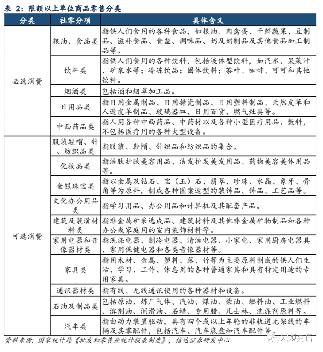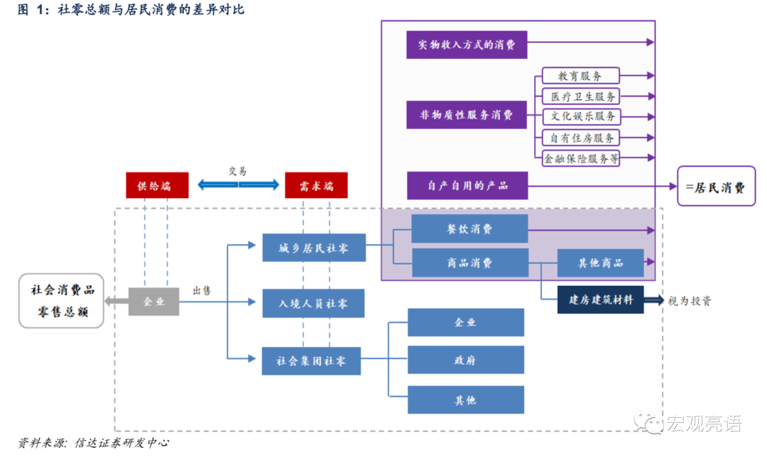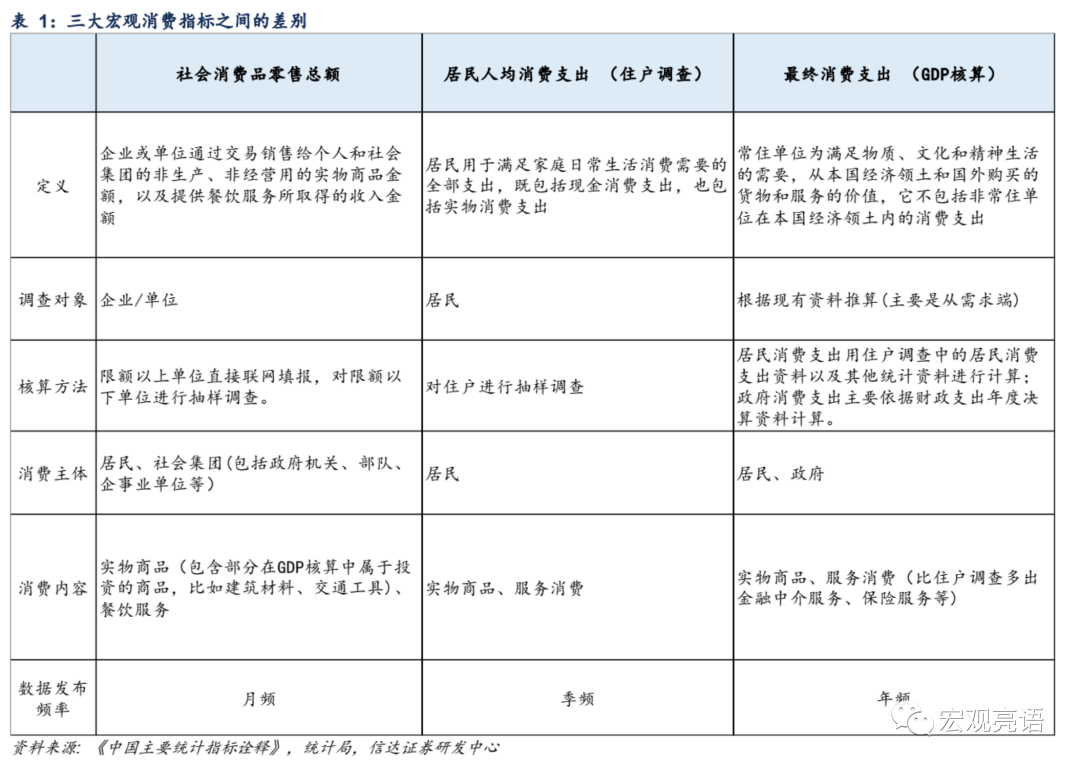 社会消费品零售总额是指企业通过交易直接售给个人、社会集团非生产、非经营用的实物商品金额,以及提供餐饮服务所取得的收入金额。该指标所涉及的商品包括售给个人用于生活消费的商品,也包括售给社会集团用于非生产、非经营的商品。其中,个人包括城乡居民和入境人员,社会集团包括机关、社会团体、部队等。社会消费品零售总额是反映宏观经济运行状况的重要指标,主要用于反映全社会实物商品的消费情况。它是从商品流通的最终环节入手,观察进入城乡居民生活消费和社会集团公共消费的商品销售变化情况。统计局公布的数据中,反映消费变化情况的指标主要有三个,社会消费品零售总额以外,还有“GDP核算”下的最终消费支出、“住户调查”下的居民人均消费支出。通过梳理三个指标的异同,我们可以对社零有更加清晰的理解。1)统计视角:社零总额侧重于供给端统计,最终消费支出侧重于需求端统计。社会消费品零售总额是从商品供给端出发,统计企业或单位通过交易取得的收入金额。由于其统计时不再区分销售对象,因此社零数据包括出售给个人和社会集团(政府机关、部队、企事业单位等)两大部分。最终消费支出主要是从商品需求端出发,统计常住单位对货物和服务的消费支出总额,这一统计数据仅针对居民与政府部分,不含其他社会集团。2)统计范畴:最终消费支出与社零总额的统计范围存在交集,但也有明显差别。社零包含实物商品消费和餐饮服务,而居民消费包含实物商品消费和服务消费,包括以货币形式购买的货物和服务支出、以实物收入方式获得的货物和服务消费、自产自用的货物价值、银行中介服务支出、保险服务支出和自有住房服务支出等。二者的主要差别表现在三个方面:一是销售给居民的零售额统计包括城乡居民建房用的建筑材料。居民建房支出被视为投资,因此不纳入居民消费支出的统计范围。二是社会消费品零售额不包括除餐饮外的非物质性服务消费。社零将餐饮服务视为特殊的商品,将其纳入社零总额的统计范围中,而最终消费支出还包括其他非物质性服务的消费,例如教育服务、医疗卫生服务等。三是社零总额不包括居民自产自用的产品,而居民消费支出则包括对这些产品的消费。![]()