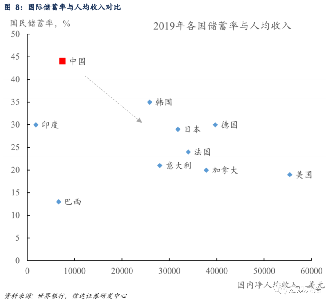 通过国际对比可以发现,目前我国的人均收入水平与发达国家之间还存在较大的差距,且储蓄率明显偏高。从这一角度来看,未来我国消费市场有较大的发展空间和潜力。