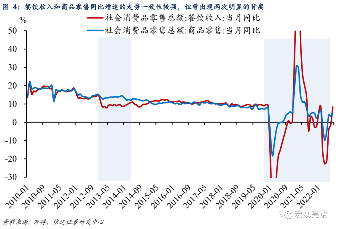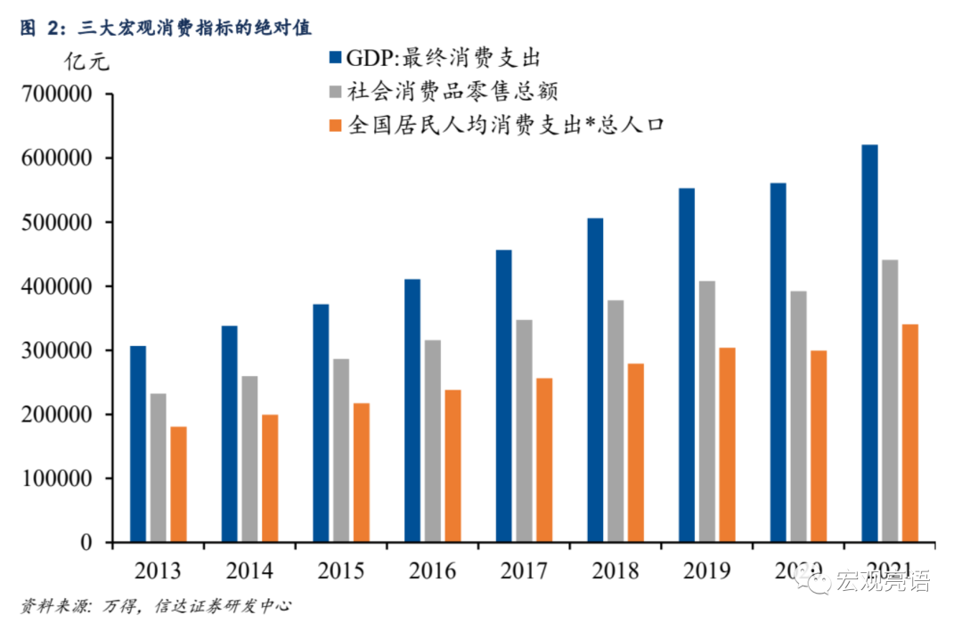 再看居民人均消费支出。居民人均消费支出属于住户收支与生活状况调查(简称住户调查),指居民用于满足家庭日常生活消费需要的全部支出,既包括现金消费支出,也包括实物消费支出。消费支出包括食品烟酒、衣着、居住、生活用品及服务、交通通信、教育文化娱乐、医疗保健以及其他用品及服务八大类。不难发现,这八个大类其实是与CPI核算中的八大类是一致的。统计方法上,居民人均消费支出的数据来源于居民家庭,和最终消费类似是需求端视角。而居民人均消费支出(住户调查)与居民消费支出(GDP核算)的主要区别在于后者补充计算了住户调查中不包含的居民金融中介服务和保险服务消费支出。由于上述的不同点,比较三个消费指标的绝对值大小,最终消费支出>社会销售品零售总额>居民人均消费支出*总人口。如果将最终消费支出的值设为100,那么2013年三者的比例为100:76:59,2021年为100:71:55。从中可以看到,一是最终消费支出与社零的比值上升了,我们推测其原因在于我国迈向以服务业为主导的经济转型,服务性消费在整体消费中占比增大;二是最终消费支出与居民消费(居民人均消费支出*总人口)的比例也提高了,可能与我国金融业近10年间的迅猛发展有关。社会消费品零售总额的调查对象主要是从事商品零售活动的批发和零售业、住宿和餐饮业法人企业与个体经营户,以及其他行业法人单位附营的从事消费品零售活动的批发和零售业、住宿和餐饮业产业活动单位。在统计调查中,这些调查对象被划分为两个部分,一部分是限额以上单位,一部分是限额以下单位。此处“限额以上”划分的标准是企业规模,具体而言,批发业为年主营业务收入 2000 万元及以上、零售业为年主营业务收入 500 万元及以上、住宿和餐饮业为年主营业务收入 200 万元及以上。1)限额以上单位,采用全面调查方法,直接进行联网填报,调查频率为每月一次。按照国家统计局要求,这部分单位须按月向当地政府统计部门联网直报各项指标数据,最后由国家统计局逐级汇总,得出限额以上单位的社会消费品零售额。2021年限额以上企业零售额占比为37.2%。2)限额以下单位,采用抽样调查方法,进行科学推算。限额以下单位采用三阶段抽样调查方法,调查频率为每季度一次。第一阶段,是抽样阶段。以省为总体,利用分层随机抽样方法抽取3-6个样本县(区),再将每个样本县(区)内全部限额以下单位划分为8个调查域,每个域采用简单随机抽样方法抽取不少于6个样本单位。第二阶段,是数据收集阶段。通过样本单位自行填报或者调查员上门调查的方式,收集样本单位本期、上期零售额数据,整理汇总到国家统计局后,就形成了样本单位数据。第三阶段,是科学推算阶段。根据已有数据推算出各域、县、省的变动系数,由下至上逐次推算,得到限额以下单位的社会消费品零售额。最后,结合行政记录,用季度数据推算月度数据。2021年限额以下企业零售额占比为62.8%。第一个问题是,社会消费品零售额的调查对象为何包含批发业,怎样理解批发业的零售额?首先我们要理解 “批发额”和“零售额”的定义。根据统计局的释义,批发额指售给国民经济各行业用于生产、经营用的商品金额;零售额指售给城乡居民用于生活消费和社会集团用于公共消费的商品金额。而“批发业”是指向其他批发或零售单位(含个体经营者)及其他企事业单位、机关团体等批量销售生活用品、生产资料的活动。简单地说,批发额的定义关注于商品的用途,而批发业则关注于销售量的大小。由此看来,批发业企业可能既有零售额,又有批发额,零售业企业也是如此。第二个问题是,社会消费品零售总额是否包括了住宿和餐饮业的住宿收入?依照社零的统计范围,社零总额不包含服务性经营收入,如住宿收入。与之同理,社零总额中的餐饮收入包括外卖的餐费收入,但不包括因外卖产生的送餐服务收入。