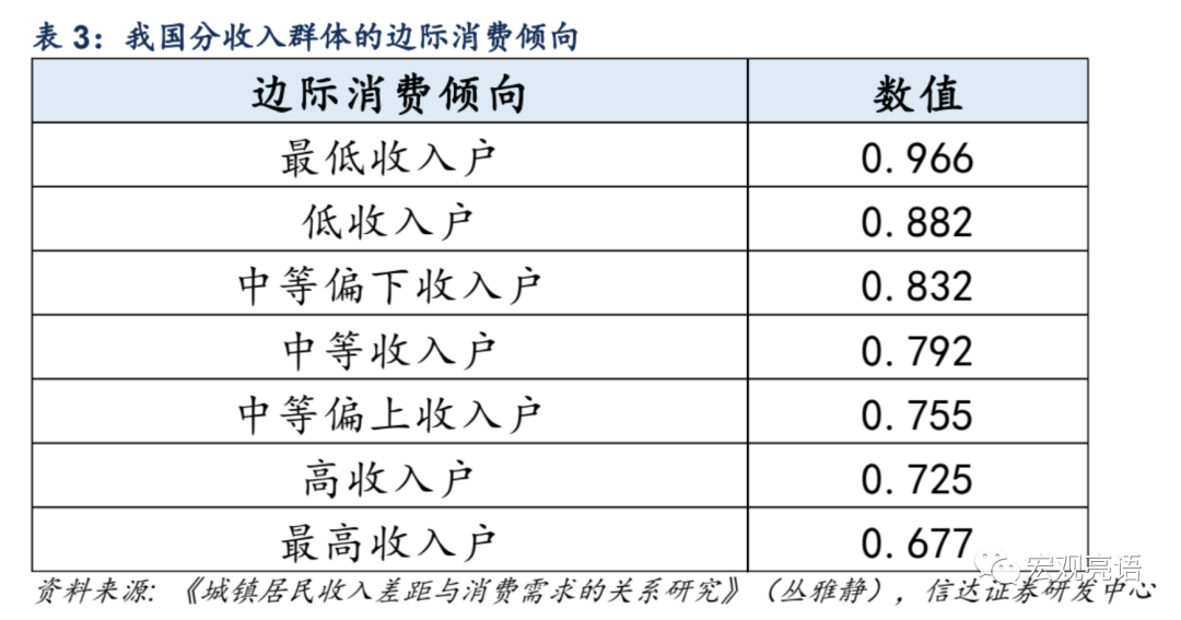 另一方面,消费倾向的变化机制更为复杂。至少有三个因素在中长期影响居民的消费倾向。一是贫富差距,贫富差距增大对居民整体的消费倾向会产生压制作用。其原因在于低收入人群的边际倾向更高,而高收入的边际倾向偏低,对于低收入人群而言,收入增加的大部分会被用于购买消费品。丛雅静(2014)对我国城镇居民各收入组的边际消费倾向进行了实证分析,结果显示最低收入户的消费倾向为0.966,最高收入户的消费倾向为0.677,验证了这一理论。二是居民对未来收入的信心,当居民对未来收入或是就业比较悲观的时候,会将部分消费转为预防性储蓄。第三是与社会保障的完善程度相关,具体包含了教育、医疗、养老等,提高城镇、农村的社会保障水平,解决居民的后顾之忧,居民才“敢消费”。