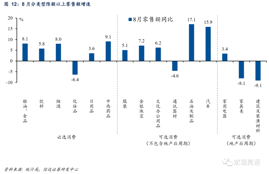 8月份,社会消费品零售总额36258亿元,同比增长5.4%,较 7 月回升 2.7个百分点,1-8 累计同比0.5%。数据的第一印象是消费呈现加速回暖的态势,然而实际上,8月社零同比提速主要是受到基数的影响。去年8月由于疫情和汛情在多地发生,叠加汽车缺芯问题限制供给,导致社零同比增速从7月的8.5%大幅下滑至2.5%,形成了去年全年的低点。从环比看,8月社零季调环比-0.05%,低于1-7月的环比均值0.41%,也显示社零复苏仍处于偏弱的状态。再看结构,除去基数扰动,8月必选消费表现优于可选消费。必选消费的5项增速均高于上月,5项之和的同比增速为12.0%,较上月加快6.2个百分点。其中饮料同比5.8%(+2.8 pct),日用品同比3.6%(+2.9 pct)。可选消费中,汽车零售表现亮眼,同比增长15.9%,主要得益于购置税补贴等刺激政策和供给约束改善。另外,在价格的支撑下,石油及制品零售录得17.1%的高增速。其他可选消费中,通讯器材类、化妆品类、金银珠宝类等增速均较上月大幅回落;房地产销售不振,导致家电、建材、家具等地产后周期消费品需求疲弱。剔除汽车,石油制品两项后的可选消费同比增长3.5%,较上月下降3.1个百分点。整体来看,8月社零呈现偏弱的复苏格局,且结构分化。在疫情反复和地产低迷的情况下,居民的消费意愿还未出现明显的改善。展望四季度,促消费政策有望不断落地生效,包括各地方推出消费券、扩大汽车消费、促进绿色智能家电消费等,另外,央行在三季度货币政策委员会例会中重点提出要“推动降低个人消费信贷成本”,降低消费贷款利率也有助于激发并释放居民的消费需求。未来如果疫情不发生大面积的爆发,居民的消费倾向有望回暖,弹性更大的可选消费可能会有不错的表现。