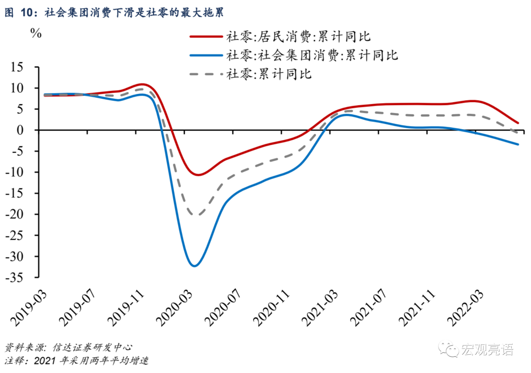 上一部分我们详细介绍了居民消费的分析方式。从消费主体视角,社零数据可以分为居民消费和社会集团消费两个部分。那么,居民社零与社会集团消费的占比情况如何呢?还有,社会集团消费的近年的变化情况是怎么样的?弄清楚这些问题对于理解当下社零的结构特征和判断未来走势也是十分关键的。官方渠道近年来没有公布社会集团消费的数据,与之相关的信息需要回溯到翟志宏,严先溥(2003,国家统计局贸易外经司)一文,文中提到1995-2002年社会集团消费的年均占比约为33.5%。但由于该研究时间较早,对近年社零结构的参考价值有限。为了更加准确地把握消费结构性分化的趋势,本文提供了一个拆分思路:先推算全国居民消费季度数据,从中分拆出商品消费的部分,再估测全部居民社零和社会集团社零。此方法能够计算出季频的居民社零和社会集团社零,时效性相对较强。人均消费支出×总人口数=全国居民总消费支出(包括居民商品支出与服务支出)相比GDP口径下的“最终消费支出”(年频),人均消费支出(季频)更为高频,便于即时观察居民消费支出情况。总人口数为年频数据,我们采用线性插值法将其转化为季频,与人均消费支出相乘,可计算出全国居民总消费支出的季频数据。全国居民总消费支出×遗漏消费系数×居民商品消费占比=全国居民商品消费支出。我们将估测得到的全国居民总消费支出,与国家统计局公布的居民最终消费支出相比较,二者间存在差距。如第一部分所述,这主要是因为居民的最终消费支出数据比住户调查中的人均消费支出数据,多核算了金融中介服务、保险服务等内容。更重要的是,“人均消费支出”口径下的数据,并不披露其中商品消费的占比有多少,但GDP口径下的“最终消费支出”数据分别公布商品和服务消费占比。基于上述两方面原因,我们构建消费遗漏系数(居民最终消费支出/全国居民总消费支出)来调整全国居民总消费支出,再与居民商品消费占比相乘,计算出全国居民商品消费支出。由此可推算出,2021年全国居民商品消费支出约为21.3万亿。在我们前面估测出的全国居民商品支出中,已将餐饮服务剔除在外。为保证与社零总额口径的一致性,我们需要将餐饮消费再次还原。为此我们构建一个遗漏餐饮系数(社零总额/商品零售额),利用该系数调整后得到全部居民社零。在统计局公布的消费三大指标中,社零总额是推算社会集团消费最基础的总量数据。当我们将入境人员的消费忽略不计时,可以通过社零总额和居民社零消费两个数据,倒挤出社会集团社零的消费额。需要补充的是,在用遗漏餐饮系数调整居民社零时,有一个隐含假设,即居民和社会集团的餐饮消费在社零中的占比相同。分拆结果显示,社会集团消费对社零总额的影响不可忽视,占比接近一半。截至2021年,社会集团消费在社零总额中的占比为45.9%。