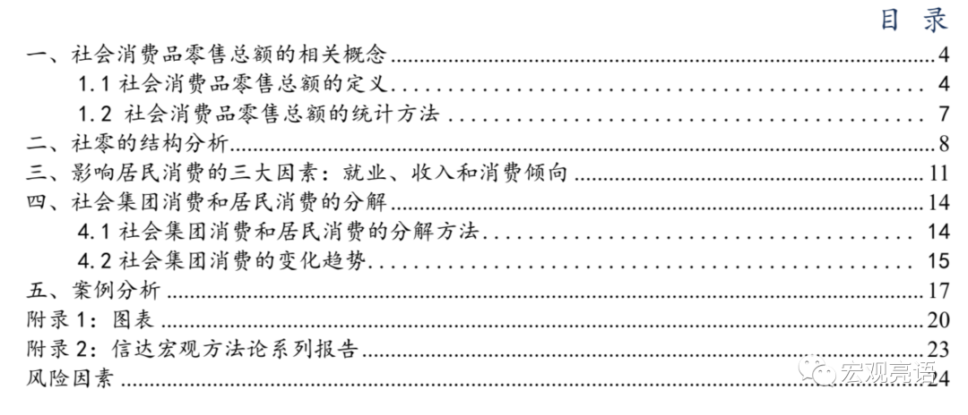 社零的结构特征。按照消费类型,可以将社零分为商品零售和餐饮收入。2017年以来,两者在社零中的占比较为稳定,商品收入占9成,餐饮收入占1成。还有一种常用的分类方式,将消费分为必选消费和可选消费。必选消费多为刚性需求,需求的变动较小,因此周期性较弱;可选消费收入弹性系数高,对经济周期更为敏感。另外,必选消费表现受 CPI 上行影响较大;而可选消费具有更新换代的特性。居民消费研究框架:就业、收入与消费倾向三因素模型。消费的变化可拆分为三个部分:消费指数(消费同比)=就业同比+收入同比+消费倾向同比。我们构建的消费指数与社零同比的走势十分相似,相关系数达0.86,验证了这一分析框架的可靠性。基于该指数,我国消费呈现三大主要特征,一是收入为核心影响因素,无论是疫情前还是疫情期间,均对消费起着决定性作用。二是就业表现稳健,对消费影响相对较小。三是消费倾向的历史波动较大,特别是疫情以来,其影响力明显提升。将社零总额拆分为居民消费和社会集团消费。社零的统计口径包含了居民与社会集团两部分,但统计局发布数据时并不予以区分。我们详细介绍了分解方法,以便全方位跟踪消费的结构性分化。基本思路是:先构建全国居民消费支出的季度数据,拆出商品消费部分后再纳入餐饮消费(与社零统计口径统一),得到居民社零。最后,再由社零总额倒挤出社会集团社零。分拆结果显示,社会集团消费对社零总额的影响不可忽视,占比接近一半。疫情以来,社会集团消费更是成为社零下降的主要拖累项。案例分析。8月份,社零同比增长5.4%,较 7 月回升 2.7个百分点。数据的第一印象是消费呈现加速回暖的态势,然而实际上,8月社零同比提速主要是受到基数的影响。去年8月由于疫情和汛情在多地发生,叠加汽车缺芯问题限制供给,导致社零同比增速从7月的8.5%大幅下滑至2.5%,形成了去年全年的低点。从环比看,8月社零季调环比-0.05%,低于1-7月的环比均值0.41%,也显示社零复苏仍处于偏弱的状态。再看结构,除去基数扰动,8月必选消费表现优于可选消费。可选消费中,汽车、石油制品零售表现亮眼,但其他可选消费疲弱。整体来看,在疫情反复和地产低迷的情况下,居民的消费意愿还未出现明显的改善。展望四季度,促消费政策有望不断落地生效,有助于激发并释放居民的消费需求。建议关注可选消费的投资机会。风险因素:新冠病毒变异导致疫苗失效;国内政策超预期等。