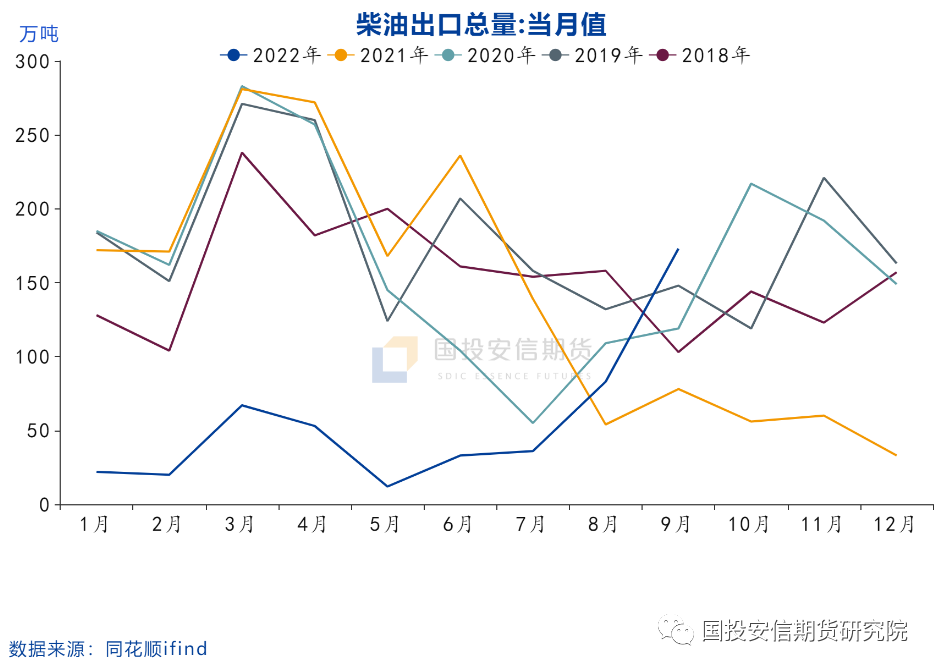 海外柴油裂解价差方面,近期整体仍呈现高位震荡,但亚欧市场震荡偏弱,美国市场震荡偏强,主要因不同市场影响因素各有侧重。中国成品油出口大幅回升,9月柴油出口量达173万吨,四季度有望维持高位,一定程度缓解了海外市场的紧缺,欧洲天然气现货价格大幅回落,炼厂氢气成本高企对柴油裂解价差的支撑作用也有所减弱,相对来说油强气弱的走势利于柴油裂解价差的回落。美国市场方面,由于二季度以来石油产品出口持续居高不下,其国内柴油库存处近五年最低位置,随着近期取暖季来临,季节性取暖需求对柴油裂解价差形成额外提振,但应注意到,从EIA发布的数据来看,美国居民取暖用油年均消费量已从上世纪70年代近100万桶/日下降至2020年19.3万桶/日,主要因取暖方式向天然气及电力转变,使用取暖油的家庭占比近年来仅4%,从消费量级来看持续炒作的空间相对有限。