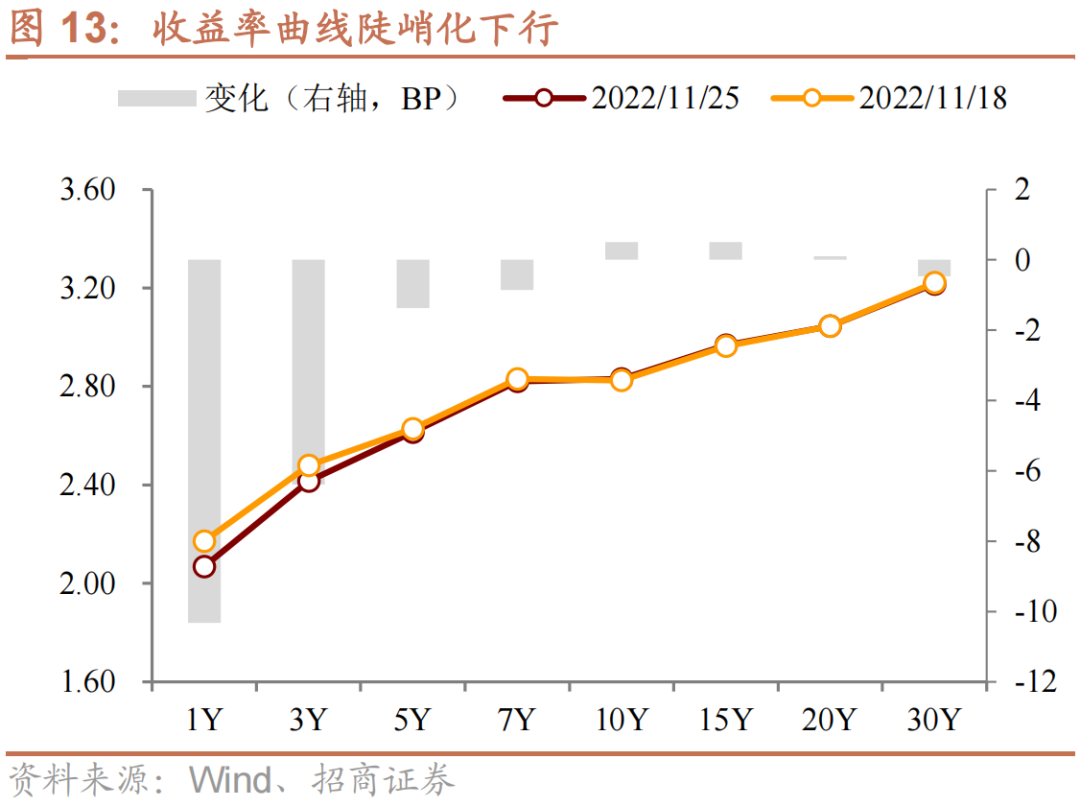 短端大幅下行。从现券收益率看,本周多数期限品种收益率下行。其中,1年期品种下行10个BP,3年期品种下行6个BP,5年期、7年期品种均下1个BP,30年期品种小幅下行0.5个BP,10年期、15品种较前期小幅上行0.5个BP,20年品种较前期基本持平。本周,银行间质押式回购周均成交规模和隔夜周均成交规模明显回升,分别为6.10万亿、5.27万亿。截至本周五(11月25日),10Y国债收益率报2.83%,较前期小幅上行0.5个BP;1Y国债收益率报2.07%,较前期下行10个BP;10-1Y期限利差自65个BP扩大至76个BP。