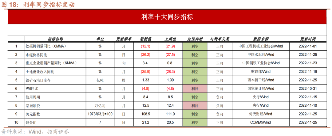 利率同步指标以“利空”为主(8/10)。本周(11月21日至11月27日),利率十大同步指标释放的信号以“利空”为主,占比8/10,较上周保持一致。