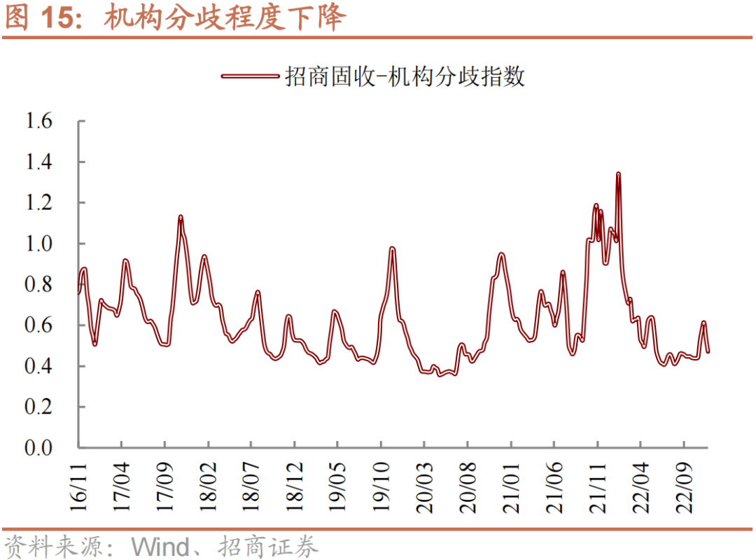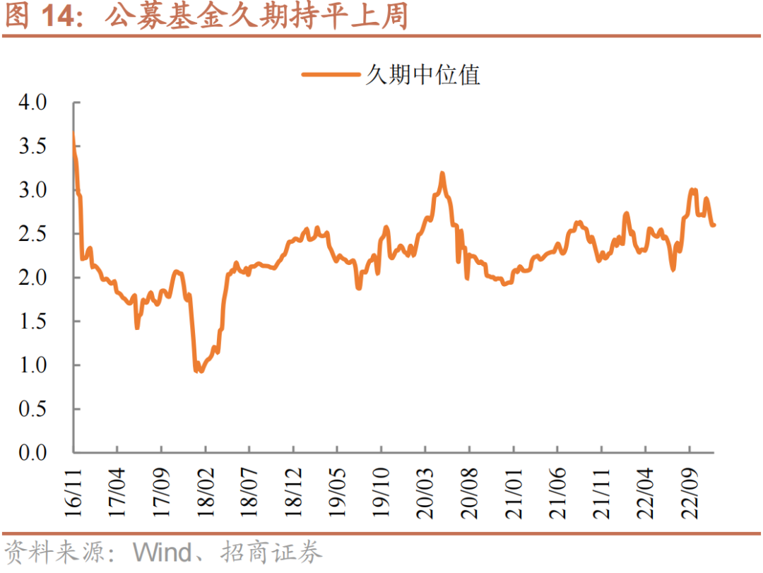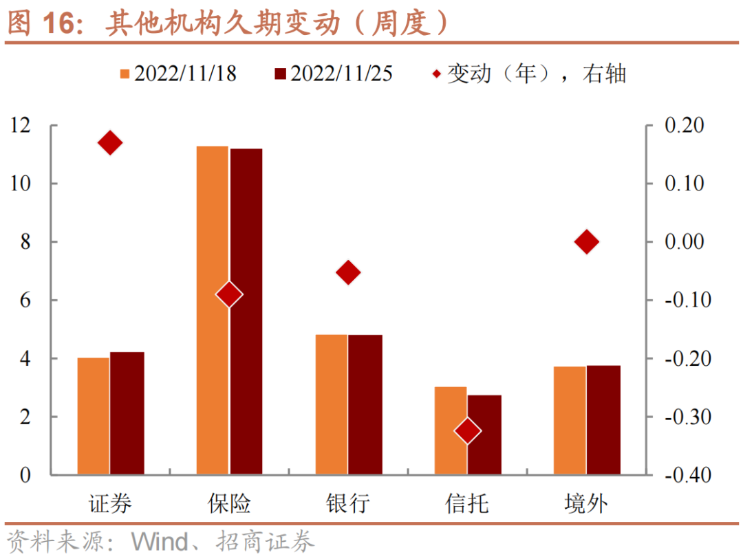公募基金久期基本持平上周,机构分歧程度下降。11月21日至11月25日,公募基金久期持平于2.60。机构分歧程度下降,招商久期分歧指数下降0.06至0.47。其余机构久期变化不一,其中,证券公司的久期上行0.17至4.23;保险久期下行0.09至11.23;银行久期下行0.05至4.81;信托久期下行0.32至2.74;境外机构久期持平于3.75。