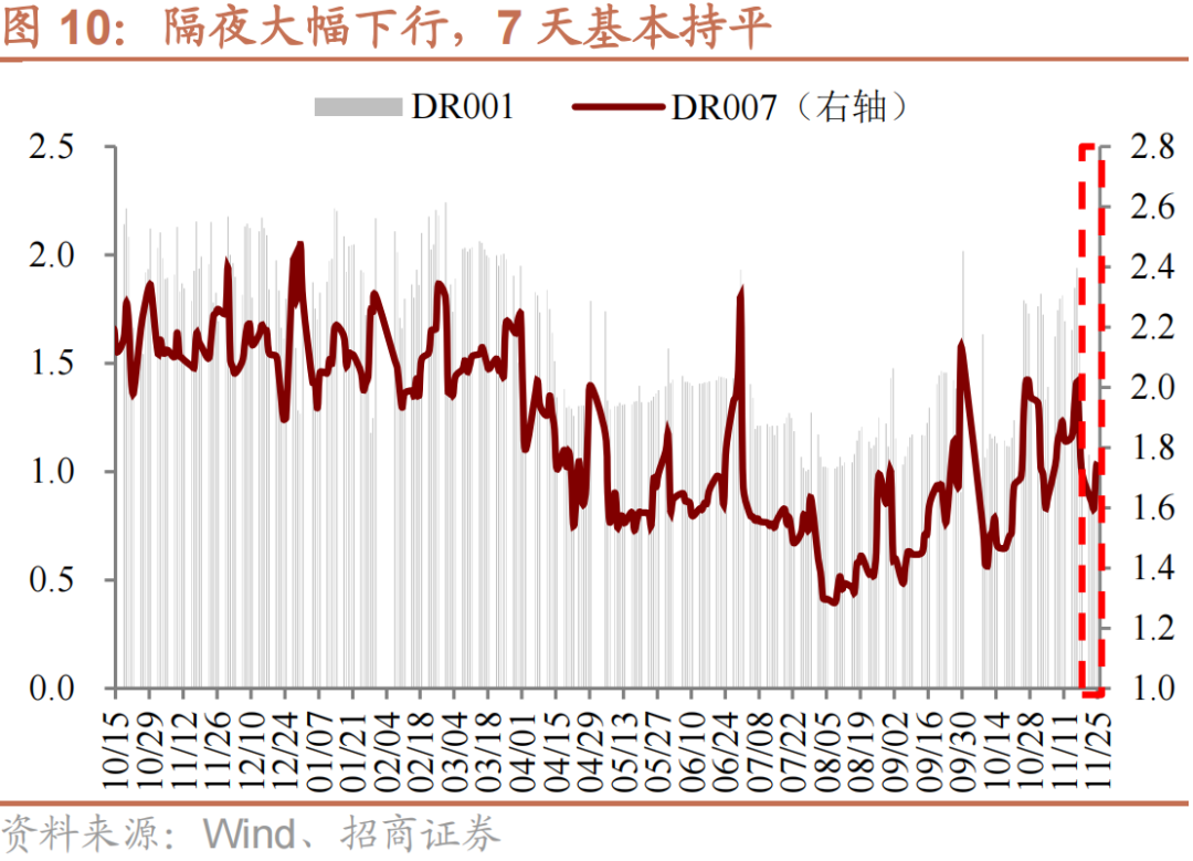 本周资金面平稳偏松。本周,共有4010亿逆回购到期,央行合计开展230亿7天期逆回购操作,逆回购净回笼3780亿。本周政府债发行缴款规模为1946亿,其中国债1520亿、地方债426亿。本周资金面走势略有分化,隔夜资金较为宽松,DR001一度下行至1%以下;7天期和14天期资金利率较前期基本持稳,其中DR007运行中枢较前期小幅下行,DR014运行中枢则基本持平前期。截至周五(11月25日),DR001和DR007品种分别加权于1.02%和1.73%,较前期分别下行29BP、上行1BP。