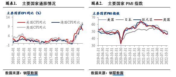 海外方面,全球制造业PMI指数自2022年初以来持续下滑,9月后更是跌落荣枯线,指数指示制造业增速边际回落,海外需求持续放缓。经济下行压力下,全球钢铁消费出现下降,生产也受到影响,1-10月全球粗钢产量累计15.5亿吨,同比下降3.9%。其中欧美产量下降幅度较大,欧洲27国产量1.17亿吨,同比下降9.2%;美国产量6813万吨,同比下4.8%。就2023年来看,欧美通胀尚处高位,全球仍处于加息周期,经济将进入衰退,海外经济数据及消费者信心指数均全面下行,预期较为悲观。在此背景下,工业原料需求难以出现大幅好转,海外铁水产量难有明显回升。