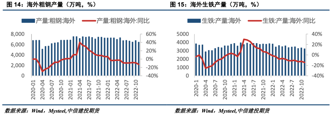 从海外国家粗钢及生铁产量的表现看,2022年海外粗钢及生铁产量同比走弱,趋势未见拐点。2022年1-11月份,海外粗钢累计产量约7.60亿吨,同比减少4714万吨,降幅5.84%,1-11月份海外高炉生铁累计产量约3.81亿吨,同比减少3831万吨,降幅9.13%。目前海外经济仍由衰退逻辑主导,粗钢及生铁产量下滑的趋势未见拐点,我们预计2023年海外需求仍将走弱,但走弱趋势可能有所减弱。预计2023年海外粗钢产量7.98亿吨,相较2022年下降约2467万吨,降幅3%左右。