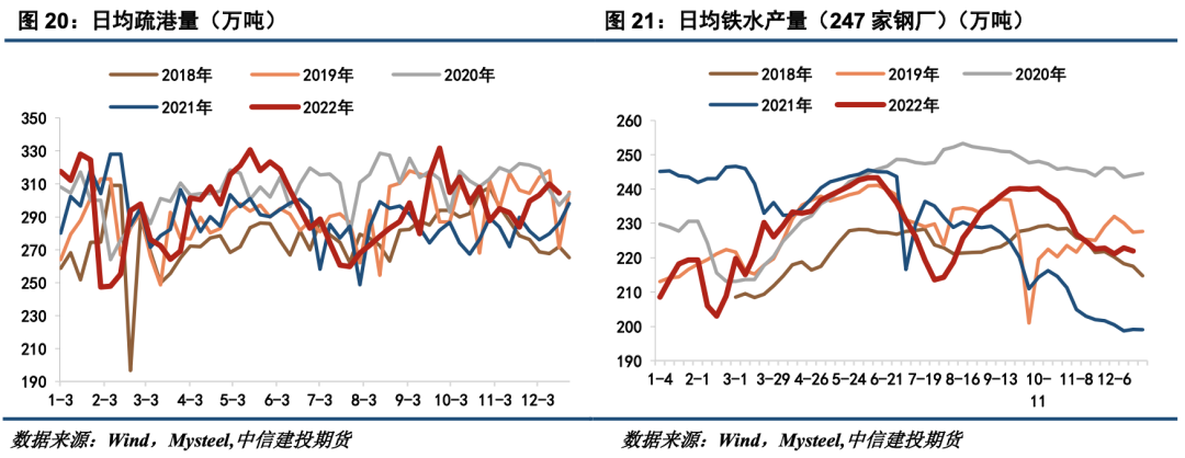 从数据上看,今年铁水产量整体表现较有韧性。铁水产量上半年随钢厂的复工复产而回升,下半年相较于过于悲观的市场预期,铁水产量下行的斜率并不大。2022全年日均铁水产量的中枢在230万吨左右,相较21年略有下降,但运行节奏相较21年偏向平缓。从运行节奏上看,今年铁水产量在6月、11月份出现明显下滑,背后对应的是成材价格回落以及钢厂盈利率的阶段性下行,11月份还受到多地疫情对于生产节奏的扰动。