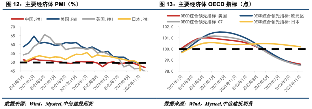 当下海外宏观环境整体走弱,粗钢需求受到抑制。2022年对于海外主要经济体是通胀与衰退问题齐驱的一年。美国在高通胀的背景下进入加息周期,预计在明年二季度停止加息。欧洲主要国家面临通胀问题同样维持紧缩的货币政策,并且受到能源危机、欧债风险等问题影响,衰退特征明显。此外,俄乌冲突、新冠疫情亦放大了经济活动中的不确定性。从PMI指标看,美国、英国、日本等国经济活动水平近期有所放缓,目前均处于荣枯线以下,OECD指标的近月趋弱亦验证了这一事实。