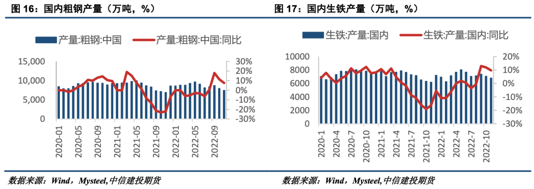 2022年国内粗钢生产略有减量,生铁产量同比基本持平。2022年1-11月,国内粗钢累计产量约9.49亿吨,同比减少681万吨,降幅0.71%,1-11月份国内生铁累计产量7.92亿吨,同比增加28万吨,与去年基本持平。相较于21年,今年国内粗钢生产未受到比较明显的政策性干扰,粗钢压减目标主要由市场化手段完成。今年钢厂长流程利润总体持续受到挤压,全国钢厂盈利率在今年6-7月、11-12月份均一度下滑至20%水平线以下。低盈利、低预期状态下的钢厂生产意愿较为低迷,粗钢产量缺乏比较强劲的利好因素。