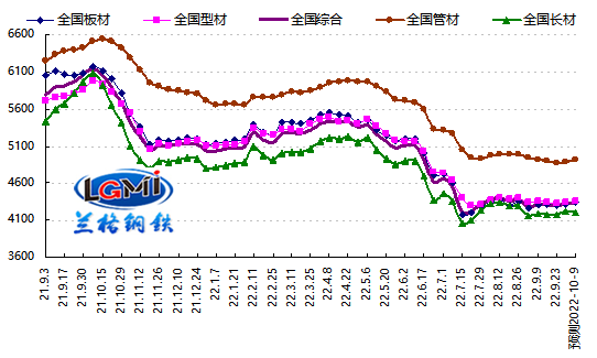 2022年第40周(2022.9.26-9.30)兰格钢铁全国绝对价格指数为4323元,较上周上升0.7%,较去年同期下降28.6%。其中,兰格钢铁长材绝对价格指数为4228元,较上周上升1.3%,较去年同期下降29.2%;兰格钢铁型材绝对价格指数为4334元,较上周上升0.4%,较去年同期下降26.0%;兰格钢铁板材绝对价格指数为4308元,较上周上升0.2%,较去年同期下降29.3%;兰格钢铁管材绝对价格指数为4891元,较上周上升0.3%,较去年同期下降23.9%。