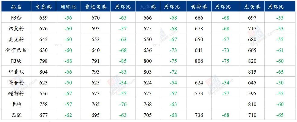 本周华东铁矿石价格弱势下跌,截至本周五,青岛港PB粉行情价格659元/吨,环比下跌56元/吨;PB块行情价格798元/吨,环比下跌68元/吨;超特粉行情价格556元/吨,环比下跌67元/吨。