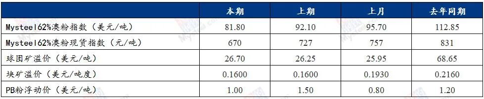 截至本周五,Mysteel62%澳粉指数81.8美元/干吨,环比上周五下跌10.3美元/干吨,下跌11.18%;Mysteel62%澳粉现货指数670元/湿吨,环比下跌57元/湿吨,下跌7.84%。