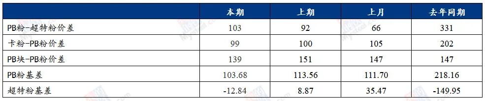 价差方面:本周高低品价差扩大,截至周五青岛港PB粉与超特粉价差103元/吨,环比扩大11元/吨;巴西矿溢价减少,青岛港卡粉与PB粉价差99元/吨,环比收窄1元/吨;粉块价差收窄,青岛港PB块与PB粉价差139元/吨,环比收窄12元/吨。期现基差方面:PB粉基差103.68,环比走弱9.88;超特粉基差-12.84,环比走弱21.71。