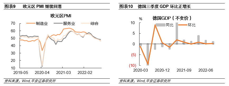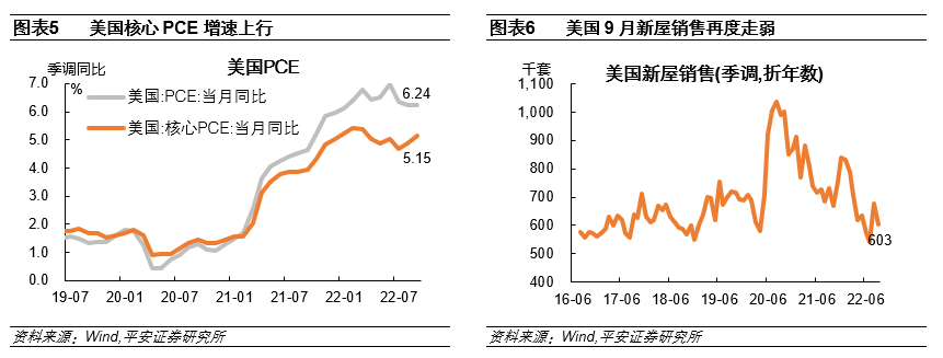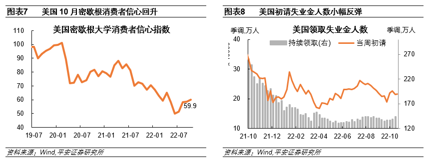 2、海外经济跟踪:1)美国经济:美国9月PCE同比增速继续放缓,但核心PCE同比加速上行。其中,商品价格环比回落0.1%,但服务价格环比上涨0.6%。,美国9月新屋销售环比大幅下降,主要受利率飙升导致房地产市场降温影响。美国10月密歇根消费信心终值回升至半年以来新高。美国最新初请失业金人数小幅反弹但整体仍保持在疫情以来较低位置,劳动力市场仍然具有相当的韧性。2)欧洲经济:欧央行继续大幅加息75BP。欧元区PMI继续回落,制造业PMI创2020年6月份以来新低。德国三季度GDP意外增长,私人消费支出仍然具有韧性。往后看,在能源短缺及货币政策收紧的双重影响下,欧洲经济前景仍然较为黯淡。