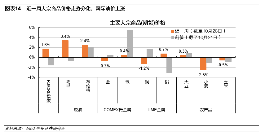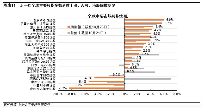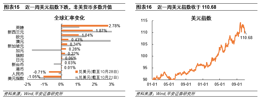 3、全球资产表现:1)全球主要股指多数延续上涨,A股、港股明显回撤。美股三大指数本周继续反弹,但Alphabet、微软、Meta、亚马逊等大型科技公司三季报表现不及预期,对纳指形成了拖累。2)实际利率回落带动长端美债收益率下行,但1年期以下美债收益率小幅上涨,整体收益率曲线继续平坦化。30年期英债收益率已回落至英债风波爆发前水平,南欧国家国债收益率亦明显下行。3)主要大宗商品价格走势分化,国际油价上涨。随着OPEC+减产200万桶/日生效在即,油价继续受到支撑。4)美元指数继续下跌,非美货币多数升值。英国政府官员本周表示正在计划增税和削减公共支出,此举受到了市场的认可,英镑升值幅度扩大。