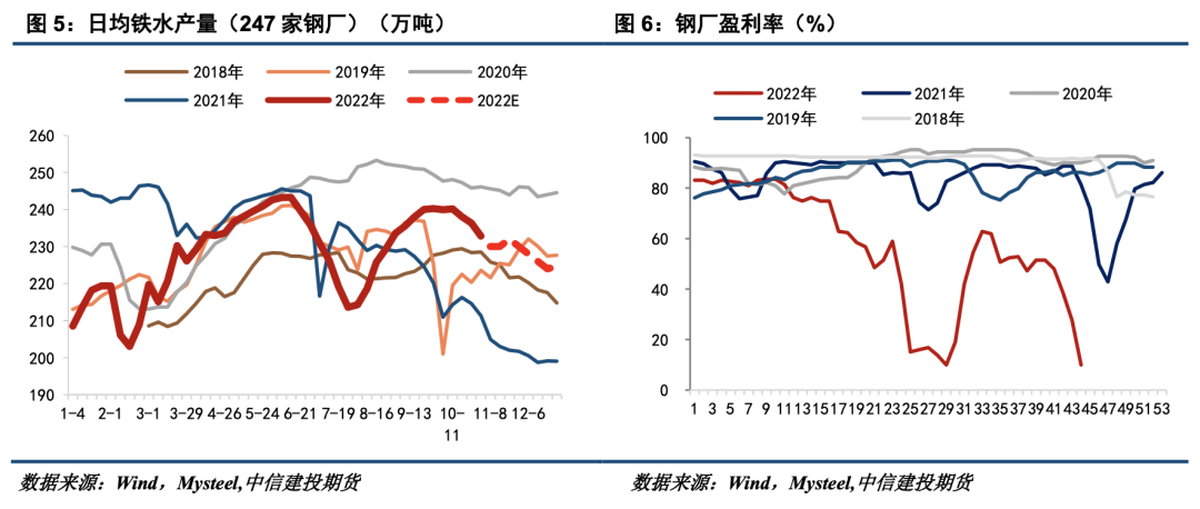 在钢厂盈利恶化的情况下,铁水产量的恢复需要多久?参考2021年末及2022年中的情况,日均铁水产量和钢厂盈利率的恢复需要一到两个月的时间,考虑到四季度铁水产量的季节性下行趋势,若近期终端需求未见大幅改善,本季度铁水产量大概率将持续下行,我们预测四季度日均铁水产量的中枢为230万吨。此外,钢厂在盈利恶化及预期悲观的情况下难以主动补库,铁矿需求的恢复需要钢厂长流程盈利预先打开空间,若成材端价格难以提涨,铁矿价格或将预先下行。