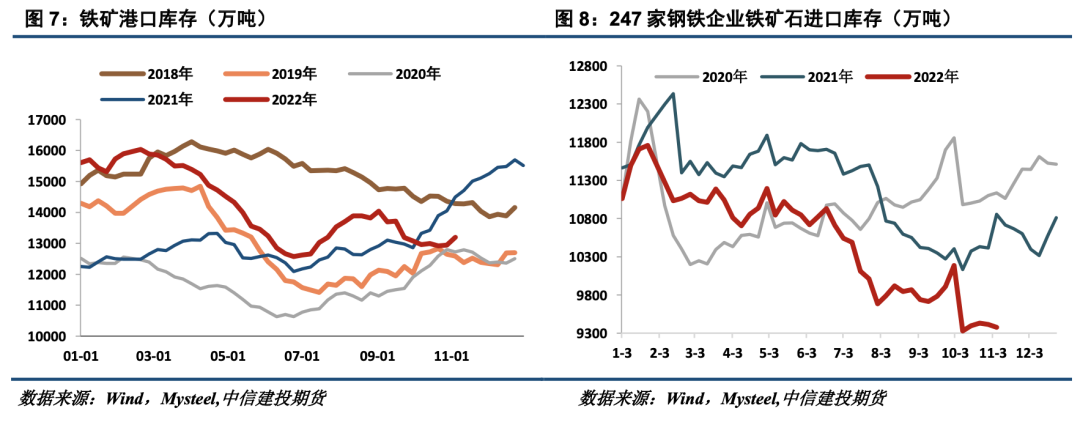 库存方面,铁矿石港口库存近两周回升,钢厂库存低位运行。十月以来钢企的铁矿进口库存持续处于历史低位水平,在长流程生产低利润甚至亏损的局面下,钢厂补库的意愿不足。近期铁矿石整体表现为供大于需,钢厂补库意愿不足,导致垒库压力主要集中在港口端,表现为港口库存的短期上行。此外,钢厂的低库存也为铁矿的中期价格提供一定支撑。