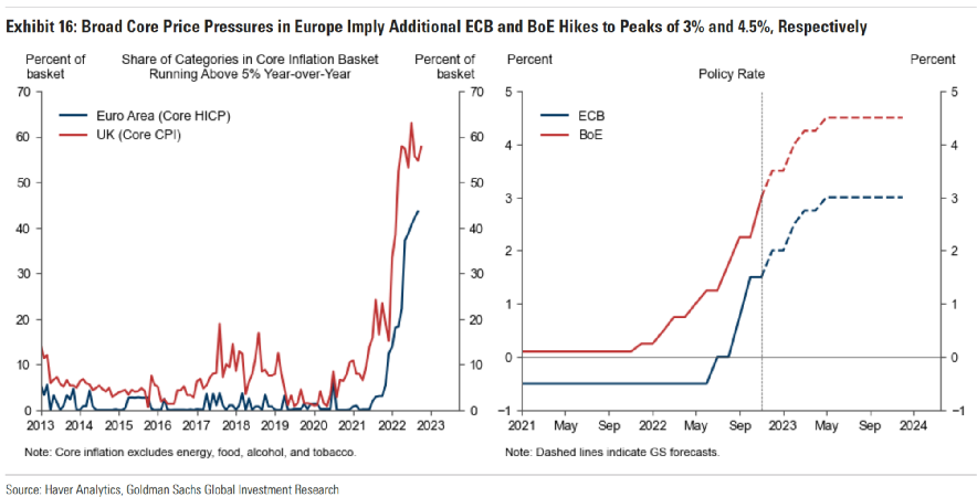 欧洲方面,高盛预期,欧元区和英国可能陷入衰退,主要是因为能源价格飙升打击实际收入。但高盛预计只会出现温和的下滑,因为欧洲已经设法削减了俄罗斯的天然气进口,并尽量减少其对经济活动的破坏,并且疫情后的复苏也将拉动经济增长。而这些变化将有助于让美国避免经济衰退。鉴于深度衰退和持续通胀的风险将降低,高盛预计欧洲央行的加息步伐将在5月份停止,3%将是利率峰值。