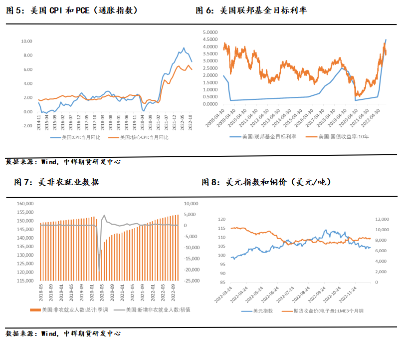 历史上,美联储经历12次加息周期,其中9次以经济硬着陆结束,经济衰退的历史概率达到了75%。美国11月CPI同比上涨7.1%,为2021年底以来最小增幅,低于预期值的7.3%及前值的7.7%;11月季调后CPI环比上涨0.1%,低于预期值的0.3%和前值的0.4%,通胀超预期回落,但是距离美联储通胀2%的终极目标仍有一定的差距。美联储公布12月利率决议如市场预期加息50bp,至4.25%-4.50%,6月以来的激进加息周期宣告结束,但随后公布的点阵图和鲍威尔的鹰派立场显示了美联储的强硬紧缩决心,鲍威尔多次重申加息将会“higher and longer”,意味本轮加息的利率会比市场预期的更长更久。近期,美国第三季度GDP被大幅上修,实际GDP年化季环比终值升3.2%,预期升2.9%,修正值升2.9%,初值升2.6%,展现了美国经济的韧性,也给了美联储继续加息的底气。此外,当前非农数据已经恢复至充分就业水平,11月新增非农就业人数达到26.3万人,非农就业总人数15354.8万人,美联储不必再在通胀和就业两者之间艰难取舍和平衡,市场不应该低估鲍威尔压低通胀的决心,后续关注的重点或许应该从加息幅度转移至缩表力度。缩表带来的真正的市场流动性收缩将对股债汇商品产生不利影响。而美国作为全球第二大铜消费市场,如果美国经济陷入衰退将削弱铜的海外消费需求,从而延续铜内强外弱的格局。