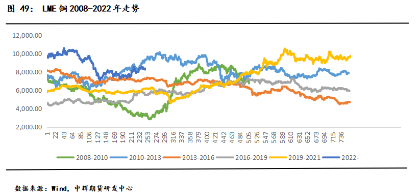 2022年,俄乌战争开启了世界新格局,地缘政治风险加剧, 1月-3月,受欧洲能源危机和俄乌战争爆发影响,原油价格开启暴走模式,铜价也节节攀升,并在3月初一度脉冲式拉涨至77270元/吨,之后随着美联储开启加息周期,铜价回落至71000整数关口。进入4-6月,受国内宏观数据好于预期和伦镍逼仓的刺激,伦铜再次走高至75000附近。随着上海地区疫情超预期发展,国内经济下行压力骤增,铜价又一路下挫至7万大关,5月美联储加息符合市场预期叠加上海疫情好转,市场对需求反弹前景乐观,铜价再度反弹至73000关口,但美国5月CPI打破了通胀见顶回落的预期。美联储6月强势加息75bp,美元走强下,铜价承压下挫。7月美联储梅开二度,继续加息75bp,国内现货紧张,铜价触底深V反弹,疫情反复叠加夏季高温限电和冷料紧张,铜现货市场出现一货难求,铜价格连续冲高迫近65000重要压力位后震荡回落,美联储9月如期加息75bp,鲍威尔强势表态“通胀不停,加息不止”,铜重回6万关口震荡盘整。10月,国庆长假结束后国内疫情多点复燃,供应扰动频发,低库存和低仓单叠加LME对俄金属禁令疑云,铜挤仓风险飙升,铜价整体重心上移。11月,美国通胀数据回落,美联储最后一次加息75bp,国内防疫20条公布,房地产三箭齐发,市场信心提振,铜突破震荡区间上沿,冲高至68000关口附近。12月,防疫政策再优化,新十条颁布,美国通胀数据超预期回落,美联储如期加息50bp,国内经济数据不佳,全国实际确诊人数短期激增,叠加消费淡季和春节临近,铜承压震荡。2022年,伦铜年跌幅约14%,沪铜年跌幅约6.2%。