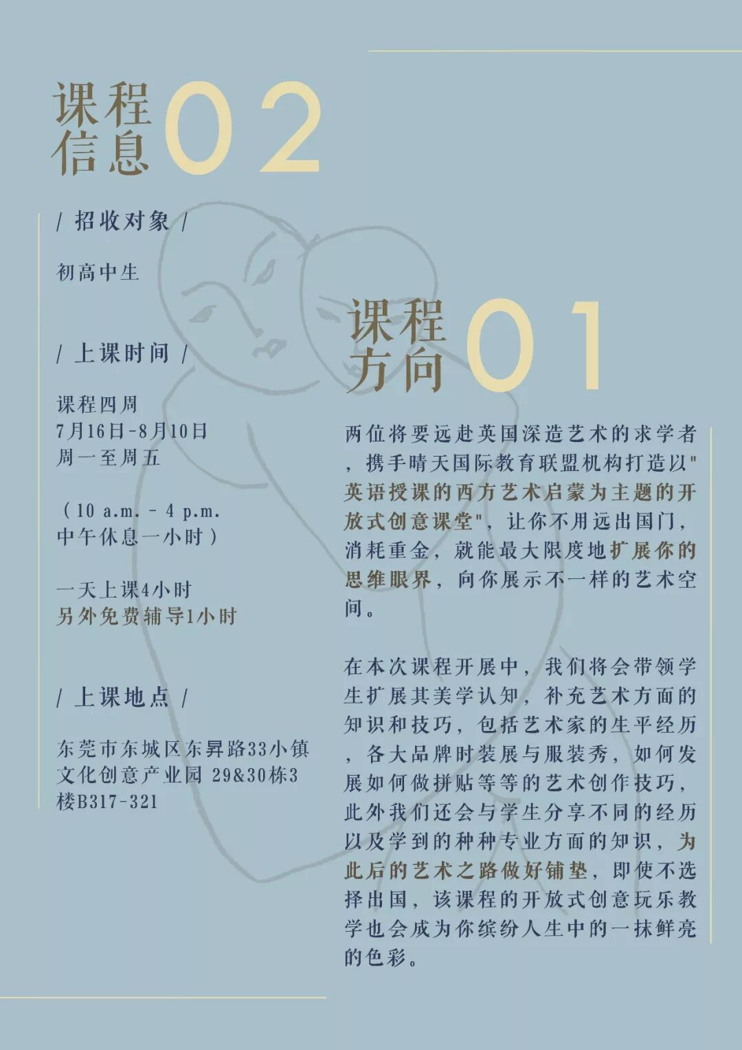 两位将要远赴英国深造艺术的求学者,携手晴天国际教育联盟机构打造以"英语授课的西方艺术启蒙为主题的开放式创意课堂",让你不用远出国门,消耗重金,就能最大限度地扩展你的思维眼界,向你展示不一样的艺术空间。