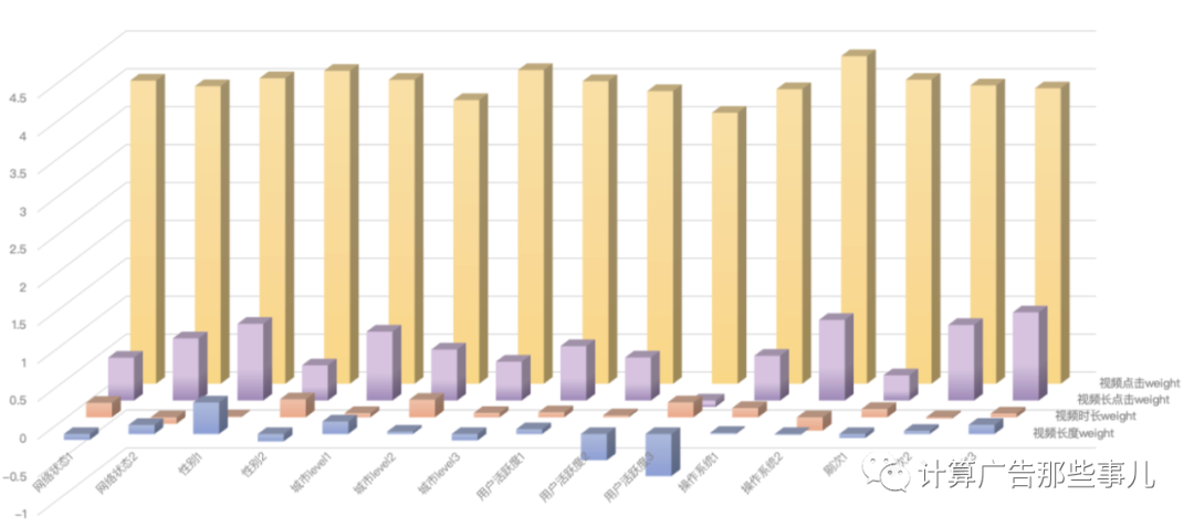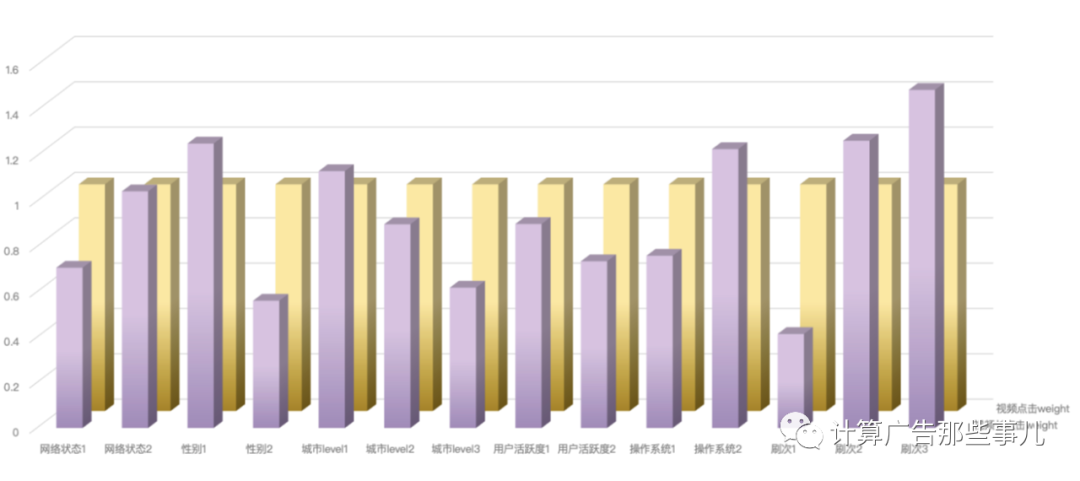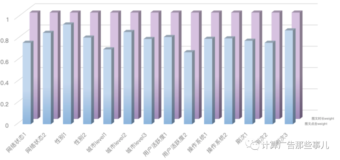 将图文时长weight缩放为1,点击weight等比缩放(点击weight / 时长weight),可以看到不同特征值下,点击weight的变化,例如,城市level的点击weight浮动较多。
