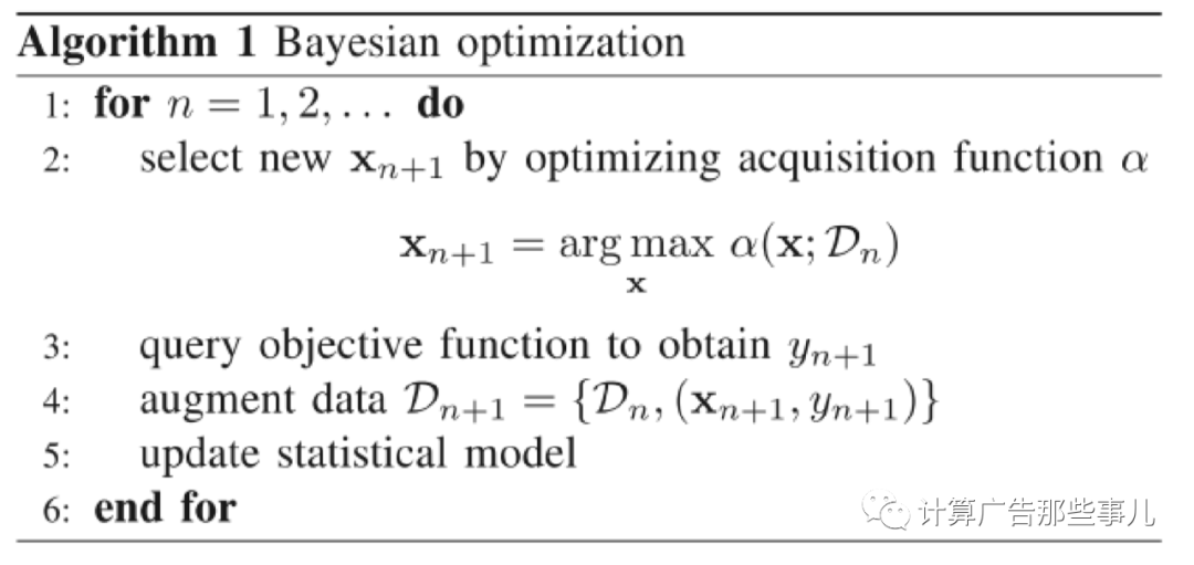 贝叶斯优化与随机或网格搜索的不同之处在于,尝试新的超参组合时,贝叶斯优化会参考之前的评估结果,求解采集函数的极值从而确定下一个采样点,可以节省很多无效尝试。算法步骤如下:
