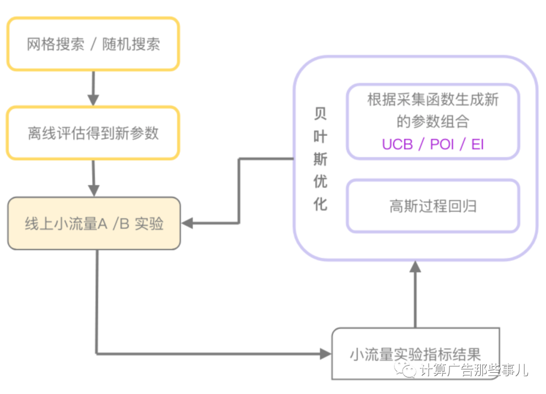 贝叶斯优化充分考虑了线上真实收益,通过收集多组小流量经验,基于小流量实验的评估结果进行参数优化。即根据高斯过程回归的结果构造采集函数,用于衡量每一个点值得探索的程度,计算下一组可能更优的采样点,并计算这组采样点的极值作为函数的极值。