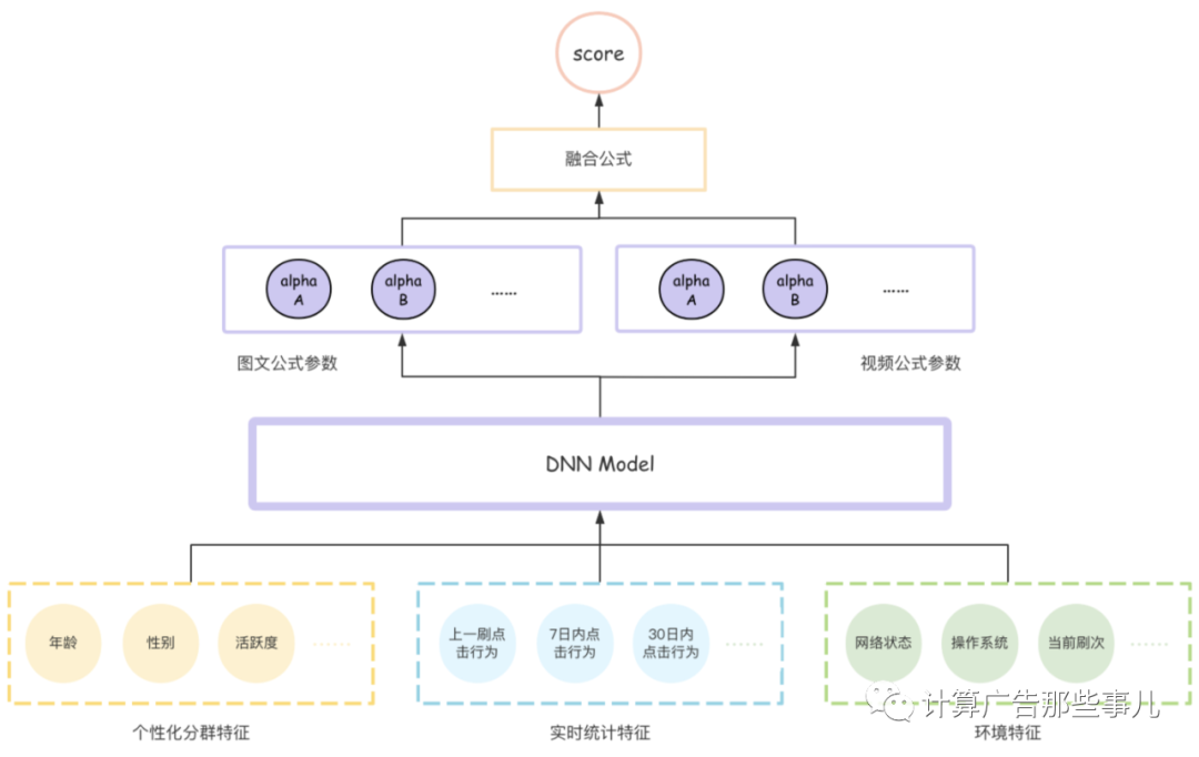 我们考虑收集更丰富的人群特征,利用深度模型替代人工状态区分策略,一方面使得公式参数具备个性化,适应不同人群的行为习惯和不同的context情况,千人千面。例如,不同网络环境、不同年龄段的人群所使用的公式参数是有差异的;另一方面,也再度打破了多目标优化的天花板,使得更多优化算法有了实践落地的可能。
