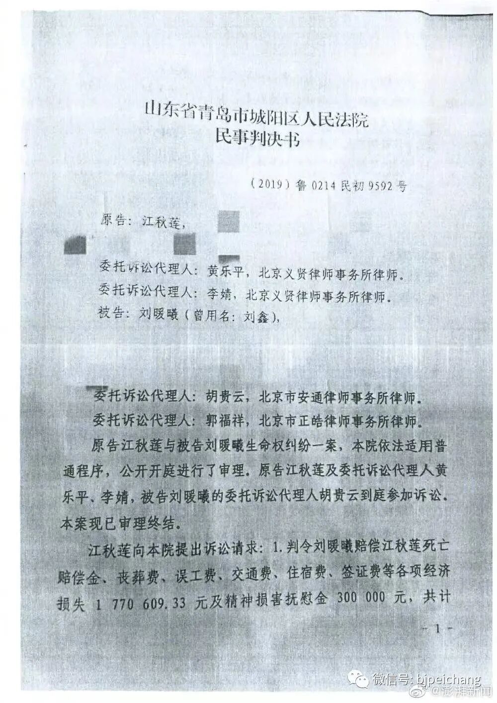 10日,江歌母亲江秋莲诉刘鑫(现改名刘某曦)生命权、身体权、健康权纠纷一案,在山东省青岛市城阳区人民法院一审宣判,法院判决被告刘某曦于判决生效之日起十日内赔偿原告江秋莲各项经济损失496000元及精神损害抚慰金200000元,并承担全部案件受理费。