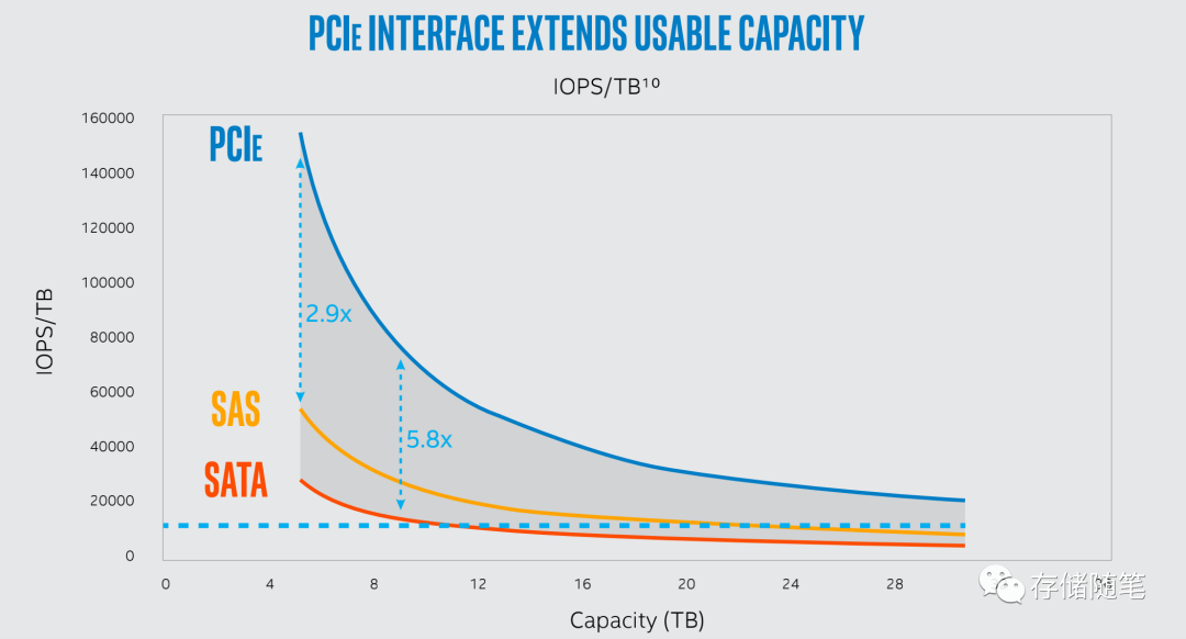 随着容量的增加,在解决方案中还有一个因素需要考虑:IOPS/TB, 也就是单TB达到的IOPS性能。容量的增加,会让每TB获得的IOPS性能也相应的下降。QLC SSD如果要在容量增加的基础上,继续保持竞争力,IOPS也是非常关键的因素。对比不同协议接口SATA/SAS/PCIe可以清楚的发现,QLC SSD搭配PCIe协议接口才是当下最具竞争力的CP组合。