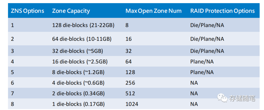 在不同的Zone的大小,对Open Zone数量和RAID配置有不同的需求。ZNS 和 Die-block 结合使用可以带来一些优势,包括更好的数据组织、更高的 I/O 性能以及更有效的资源管理。ZNS 可以将存储设备划分为一系列连续的逻辑分区(zones),每个 zone 具有预设的最大容量。这种设计有利于顺序写入,从而降低写入放大效应和延迟。但也存在一些潜在挑战,如如何有效地分配和管理 zones,如何平衡不同 dies 或 LUNs 之间的负载等。