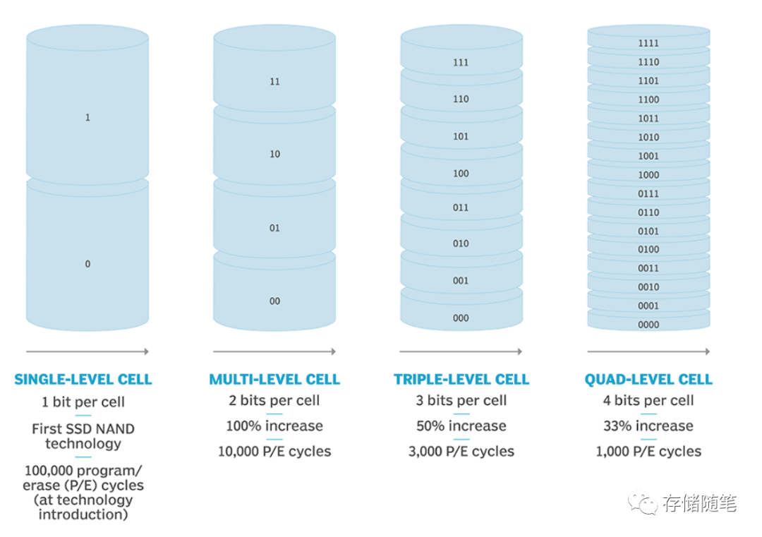 我们在回顾下NAND常见的四个类型:SLC、MLC、TLC、QLC。SLC的Program/Erase(P/E) Cycle可以达到10万,MLC P/E cycle可以到1万,到TLC 3000次P/E cycle,再到QLC NAND只有1000 P/E cycle。P/E cycle是表征SSD寿命的最重要的参数。