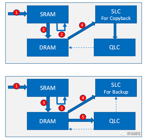 为了解决以上问题,业内有这么一种做法,使用 2-stage 缓存(SRAM+DRAM)处理数据操作和编程的方案: