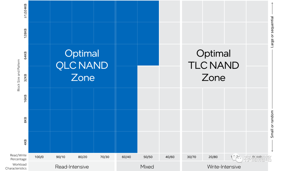 基于以上的性能数据对比,QLC SSD想要闯出一片属于自己的天空,不能正面硬刚,要选择自己擅长的领域。QLC在读方面与TLC的差异不大,因此QLC SSD的目标使用场景也主要是读为主的业务场景。TLC/QLC分别在block size块大小和读写分布的适用性,如上图总结。找准了自己的定位,QLC SSD就可以发挥自己的优势,带着梁静茹给的勇气向前出发了!