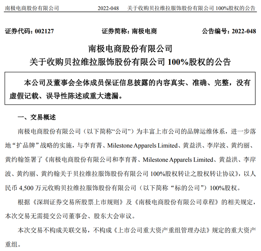 8月18日,南极电商发布公告称,为进一步落地“扩品牌”战略实施,以人民币4500万元收购贝拉维拉服饰股份有限公司100%股权。