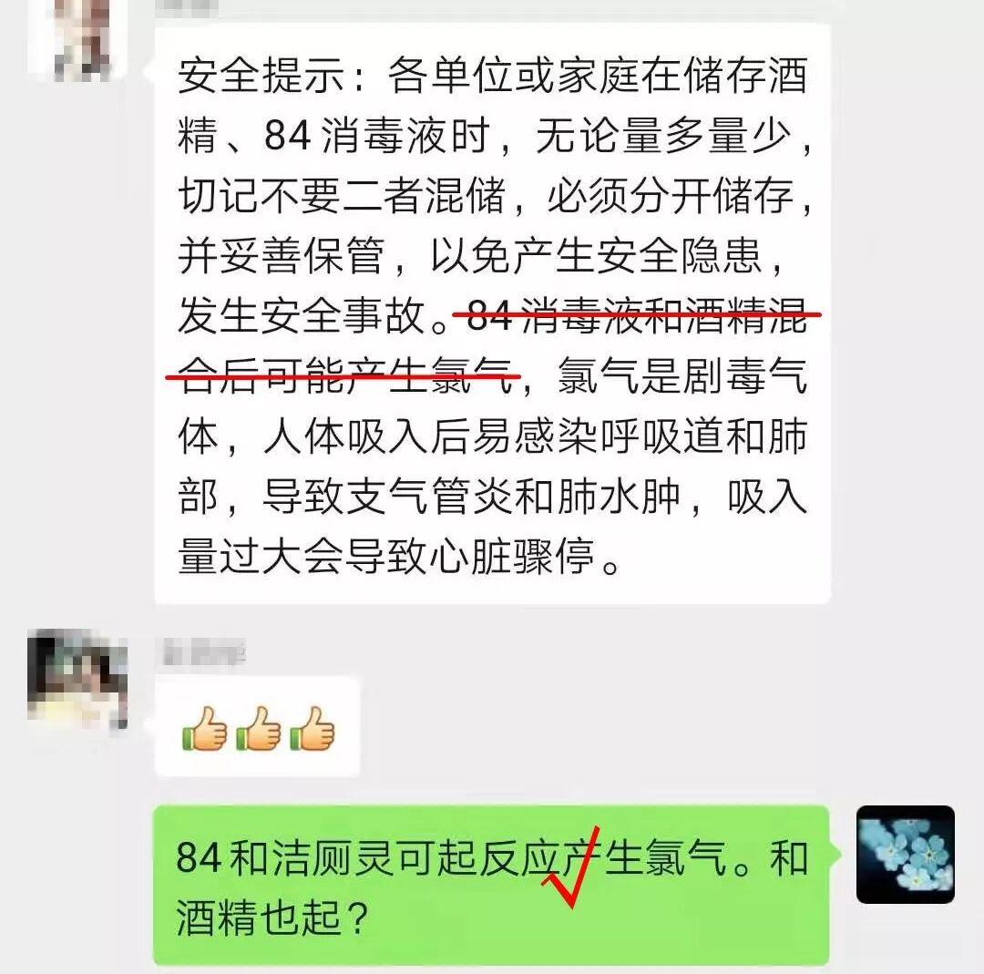 这是我的一个朋友跟她的物业对话的截图。删除线和对勾是我打的。84消毒液跟酒精不会生成氯气,说明我的这位朋友还是有化学基础的