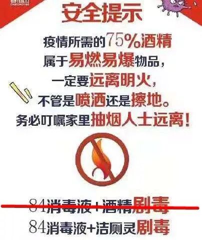 这种提示的出发点是好的,提醒酒精易燃易爆也是对的。但是,里面有两个错误。其一是酒精根本没必要去喷洒和擦地;其二,酒精跟84并不会产生剧毒物质。