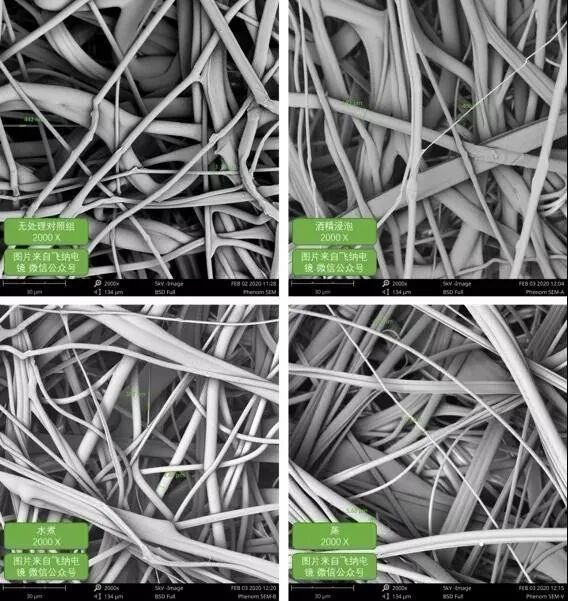 如果说这仅仅是结构表象的话,那我告诉你,2015 年就有人做过压降测试以推断酒精处理是否会影响纤维的结构?结果显示,酒精浸泡处理之后过滤器,相比于空白对照样,其压降几乎没有变化,这意味着酒精处理并没有破坏过滤器的纤维结构,并未改变空气通过效率。如果上面的照片你看不清楚,我们继续放大到2000倍来看:
