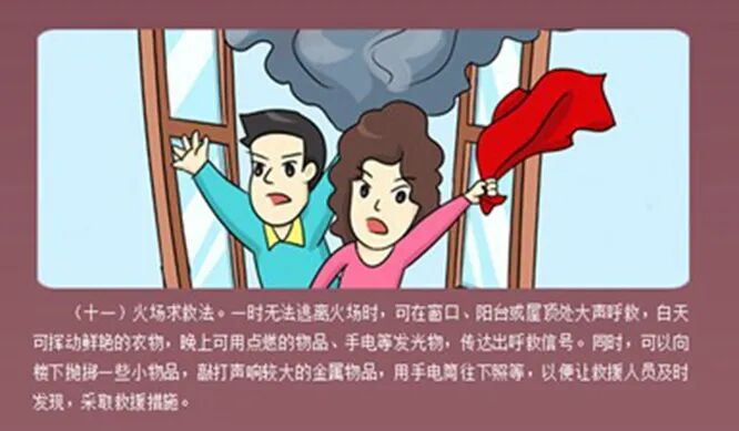 记住:如果当火灾已经蔓延到你所在的单元时,无论你跑到窗口、阳台去做什么,都是非常危险的行为!