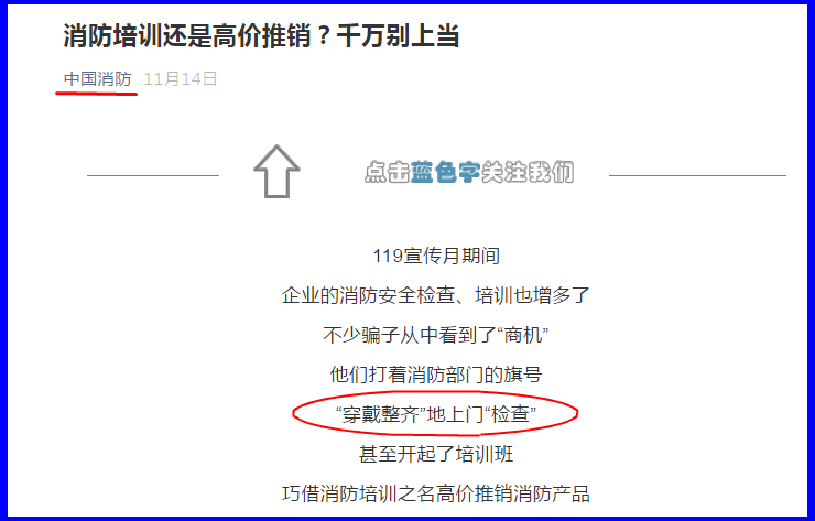 因为这伙人的猖獗,《中国消防》公众号近期又发文提醒公众:《消防培训还是高价推销?千万别上当》: