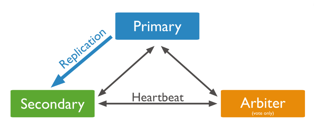 Secondary 持续复制 Primary 节点的数据;Arbiter 用于心跳检测和选举,不接收数据。