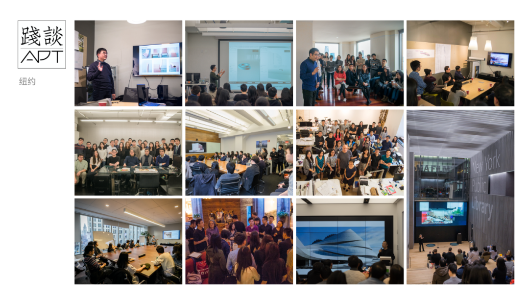 作为社群组织者,于2014年发起了美东地区最大的青年建筑师组织“践谈APT”,关注建筑设计实践的经验分享和心得交流,现已发展为由纽约、芝加哥、上海、北京等多个城市组成的数千名建筑师共同营造的建筑师社群。